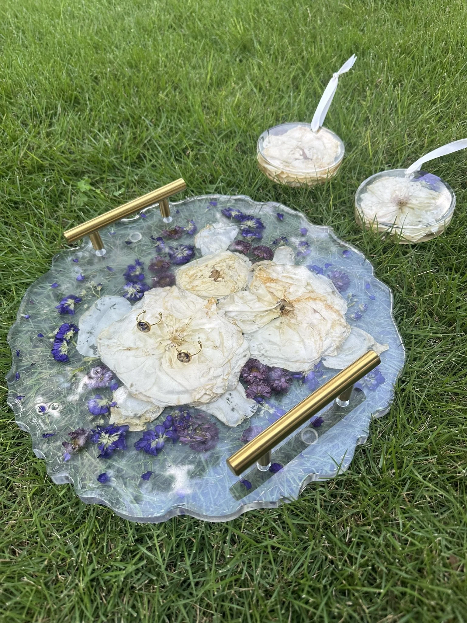 X-Large Tray (Gold), Ornament with writing, Coaster Set, and Medium Jewelry Tray