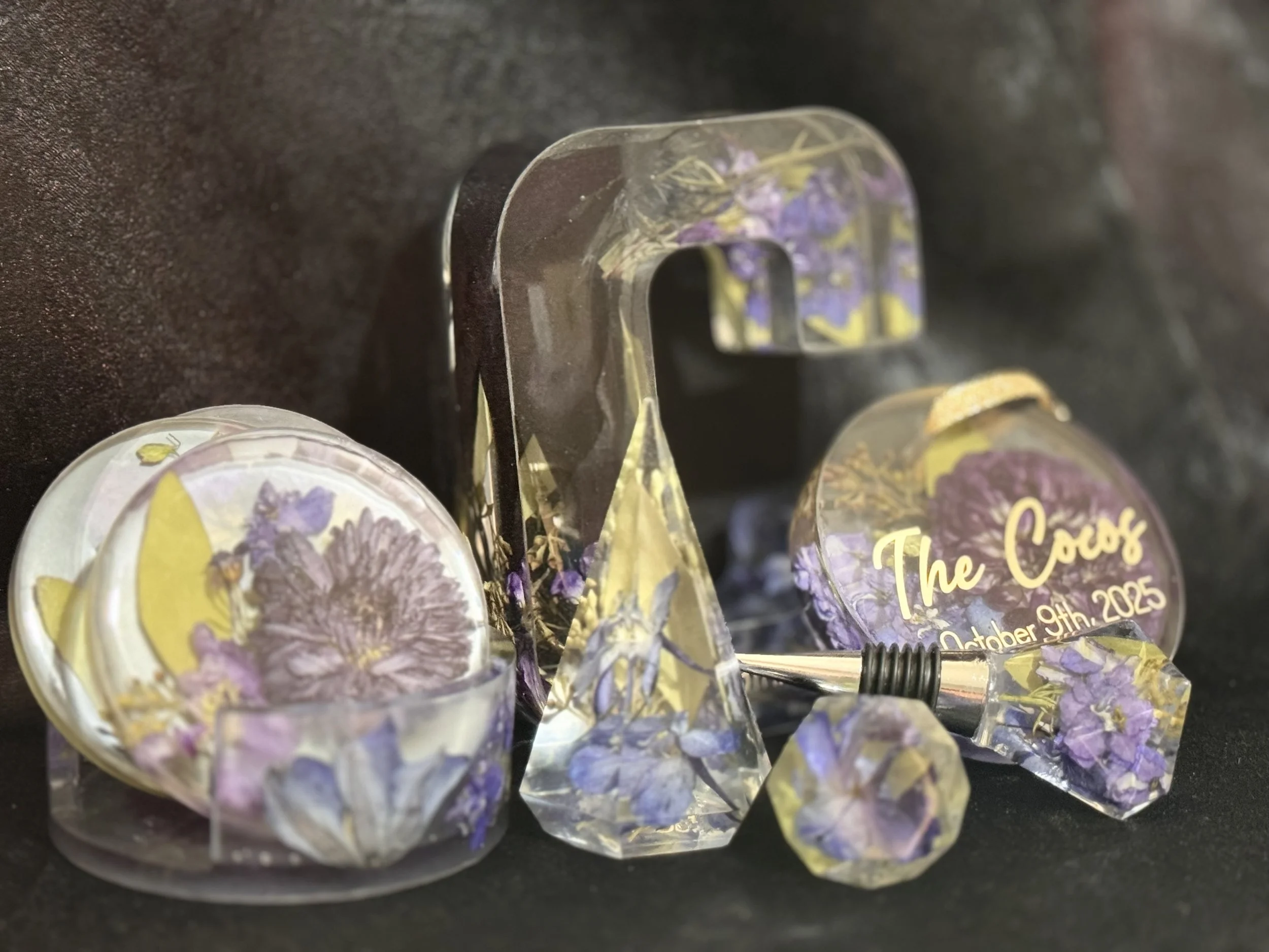 "C" Medium Letter, Ornament with writing, Coaster Set, Ring Holder, and 2 Bottle Tops